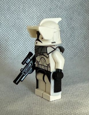 Phase 1 Clone Trooper with White Visor, and grey/white pauldron and White lined Kama/waist cape and Lego rifle.